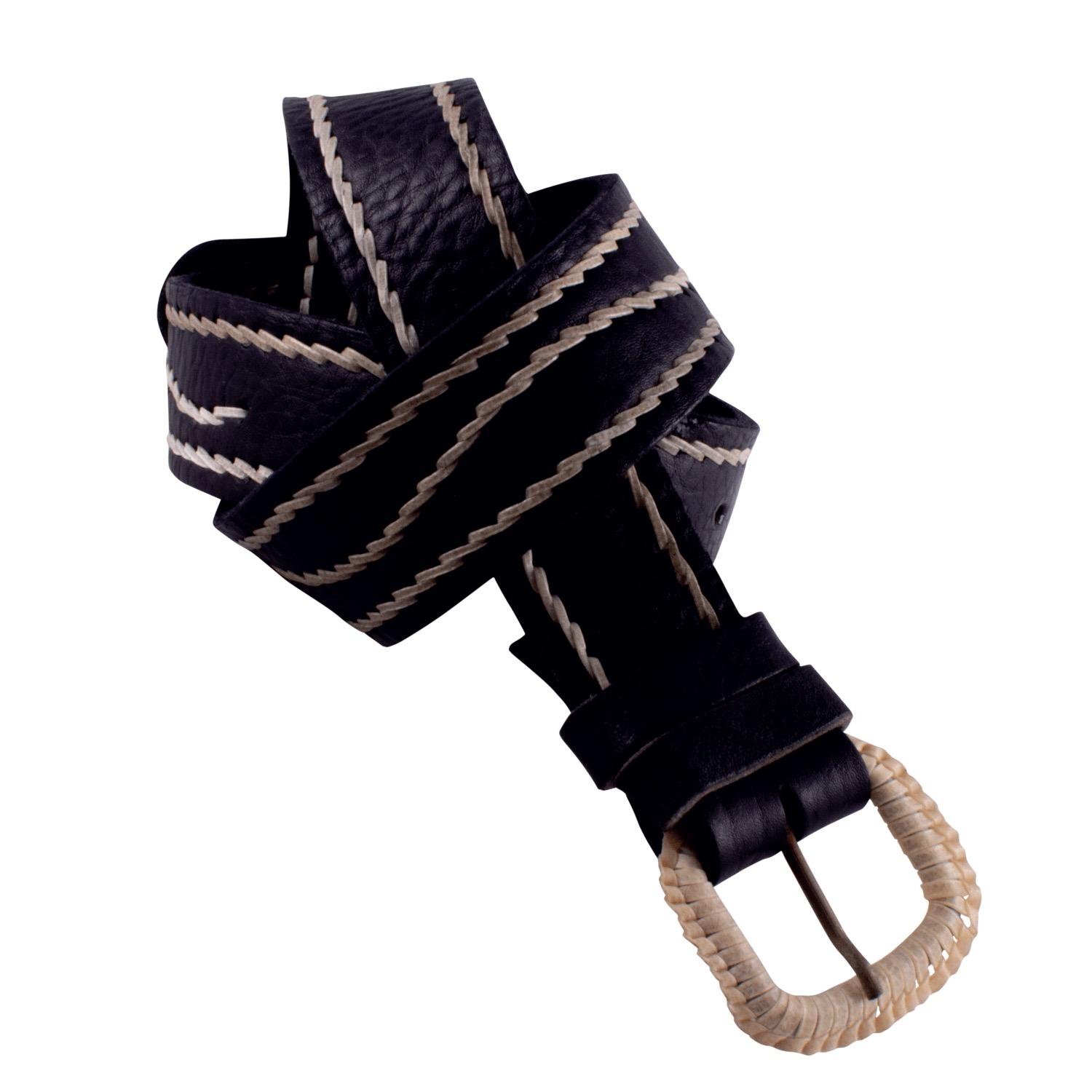 Cinto De Cuero Suela Negro Bordado En Centro Con Hebilla Forrada En Tiento
