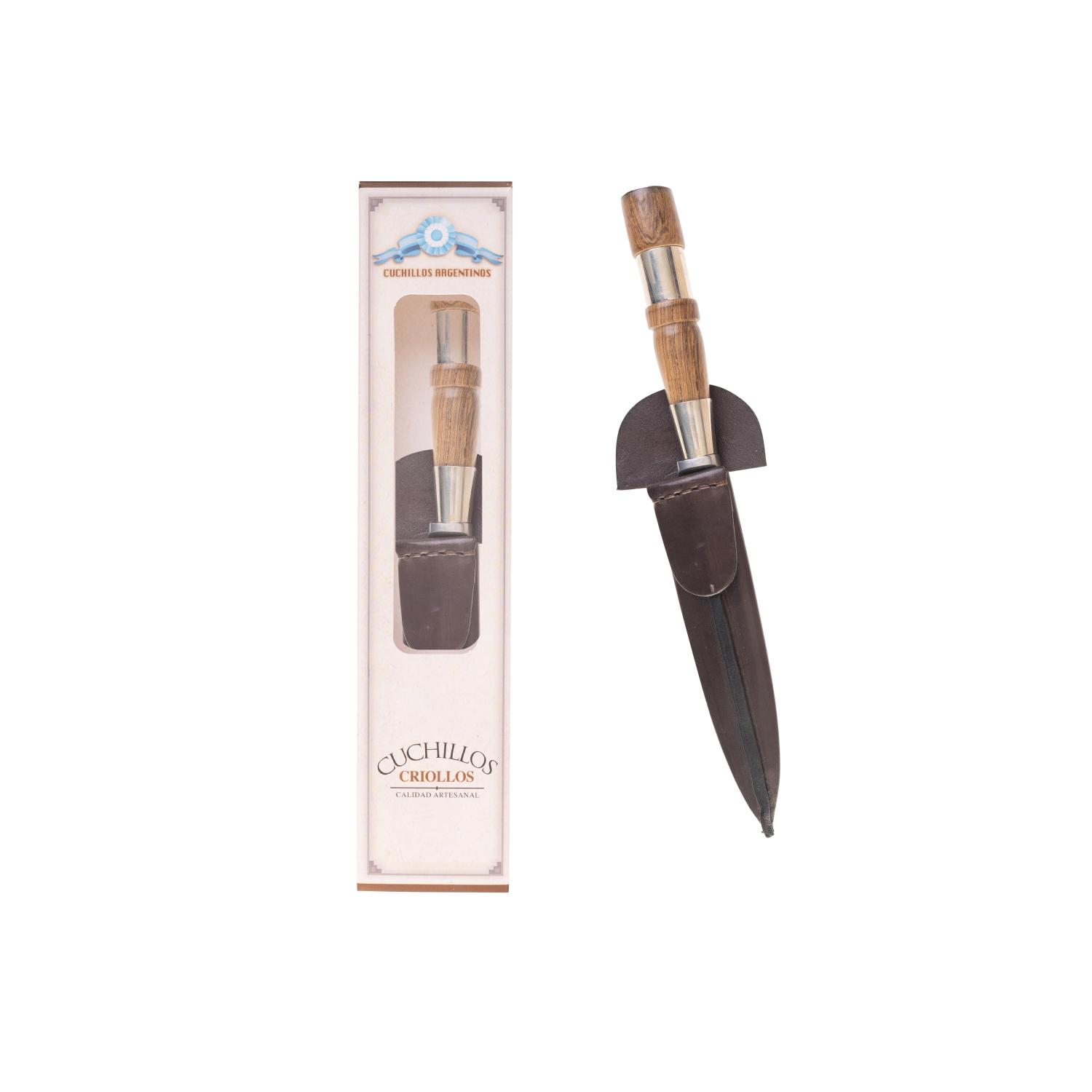 Cuchillo Hoja Acero Inox. Schmieden 14 Cm Encabado Madera Con Virolas De Alpaca En Vaina De Cuero Vaqueta Cosida (CUC544) Grabado C/Caja